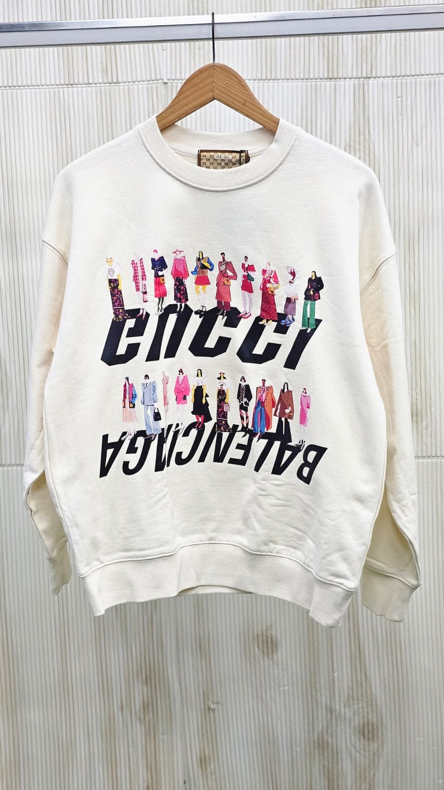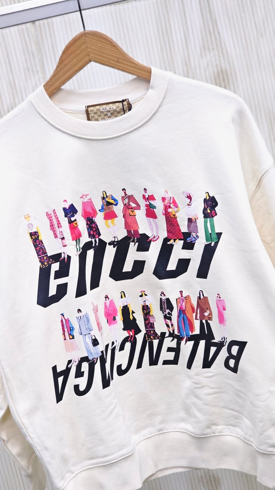 Crafted from premium off-white cotton, this crewneck sweatshirt is a wearable statement. The bold graphic print on the front features a dynamic depiction of a fashion crowd, cleverly interspersed with both the iconic “GUCCI” and “BALENCIAGA” branding. This visual interplay highlights the collection’s central theme: the playful subversion and reimagining of each brand’s distinct codes.